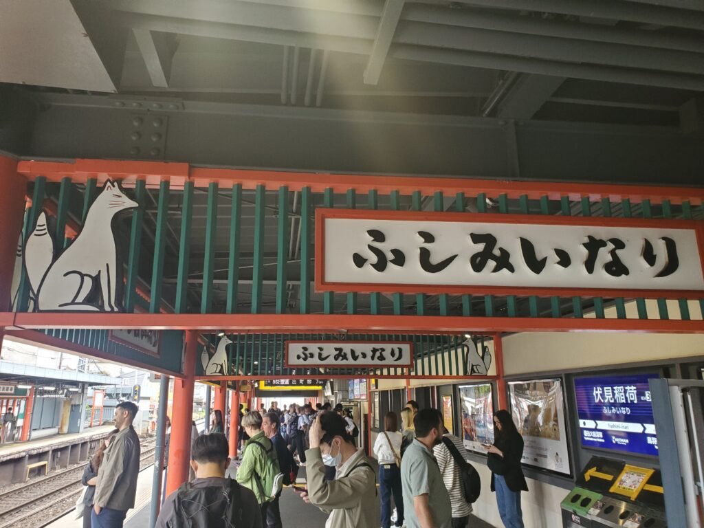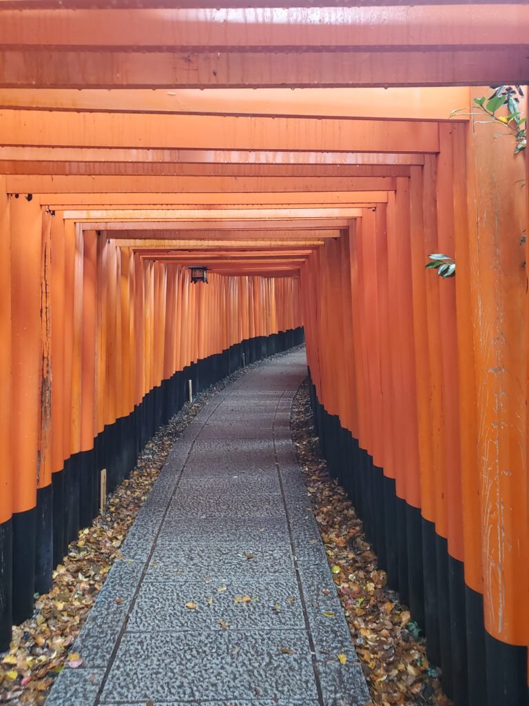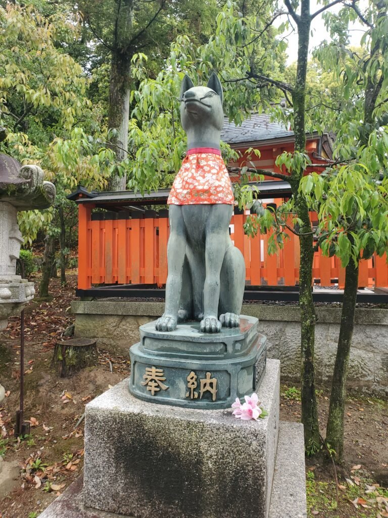 Since I didn’t have time to climb the whole mountain, I cut across a side path and found a quieter stone walkway lined with lanterns and walls as I headed back down. I also spotted quite a bit of kitsune (fox) imagery, as they are deeply integrated in the culture of this shrine.