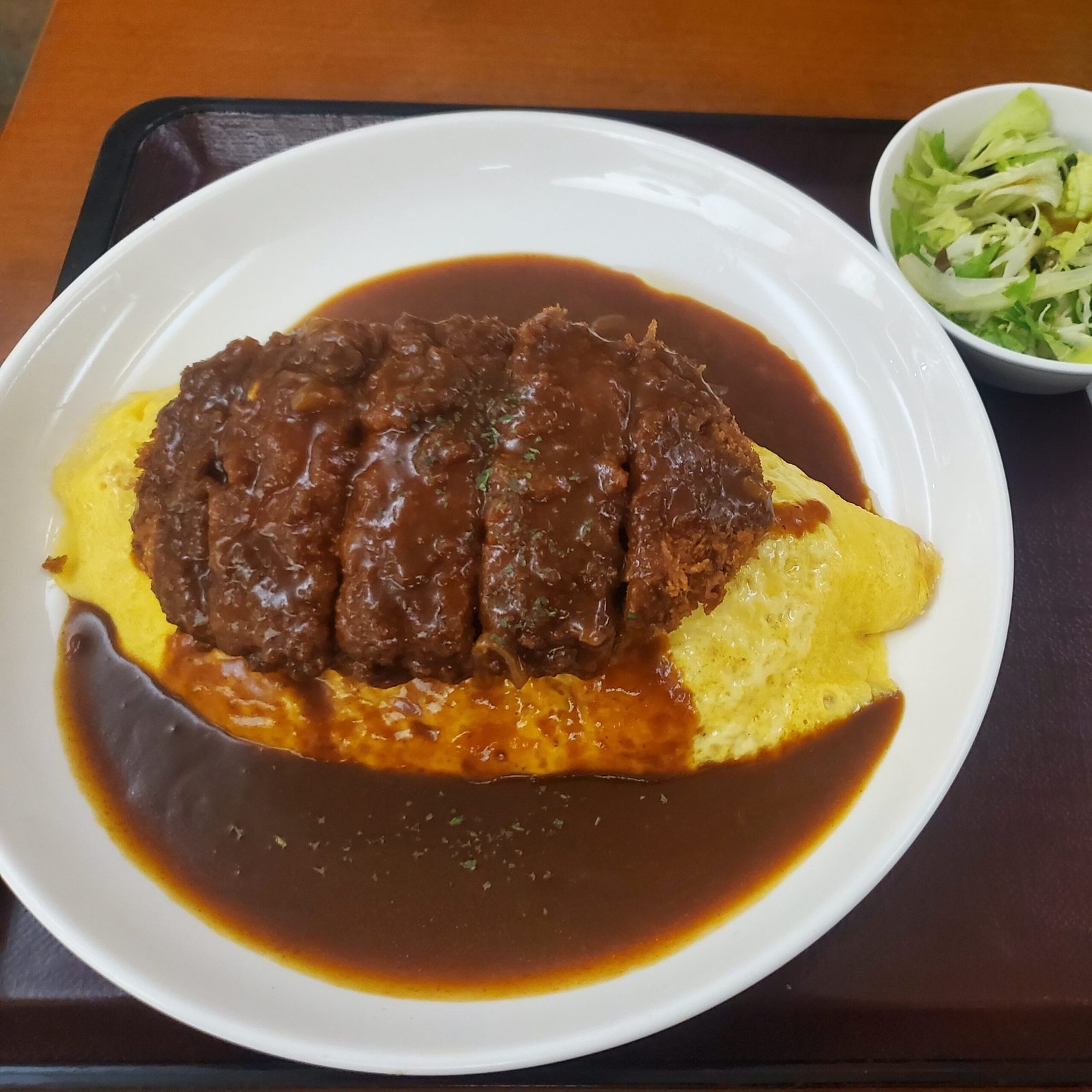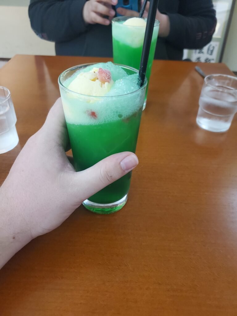 Carlos and I both went for melon soda floats, a neon-green Japanese classic topped with vanilla ice cream – sweet and refreshing! We also ordered the same thing for our main dish: fried pork loin (katsu) served on top of omurice (an omelet wrapping rice), with a sweet glaze and curry sauce. The portions were huge, yet a really good price! Everything was delicious, and it ended up being one of the most satisfying meals of the trip. Now, we were fueled up and ready to start exploring.