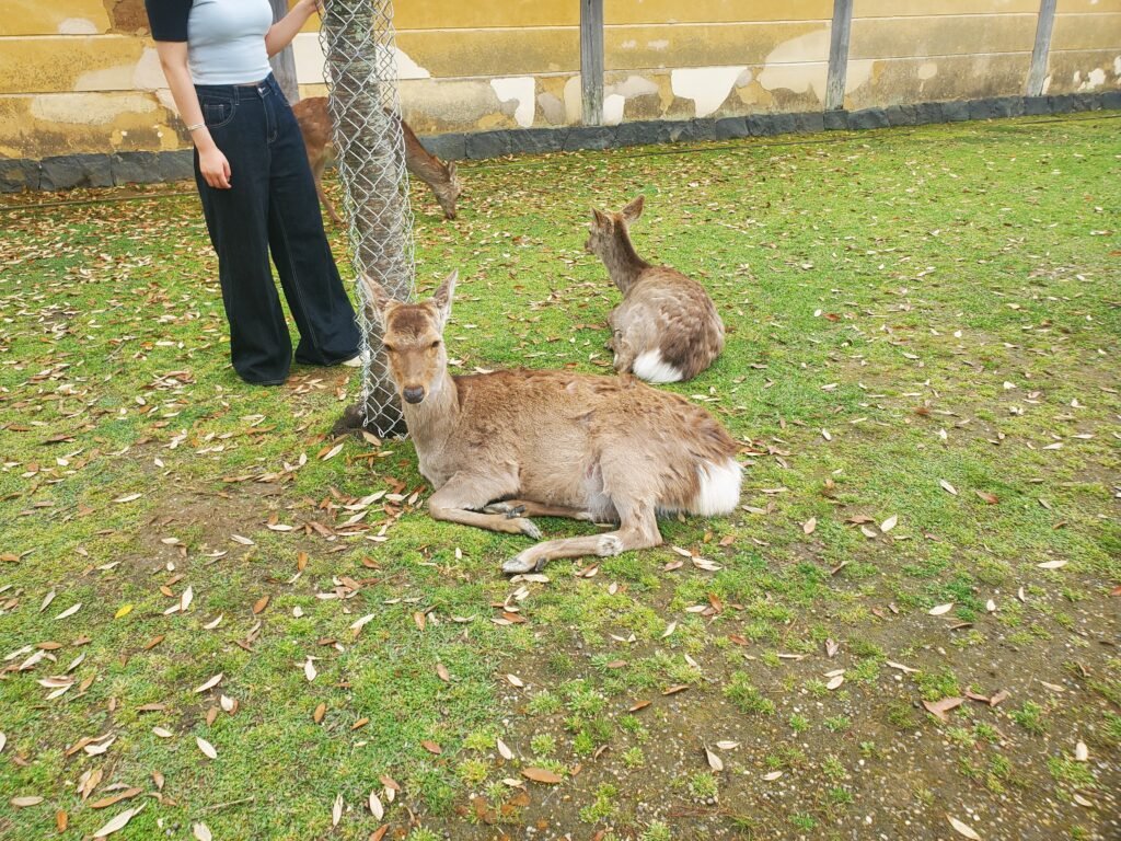 We first walked up toward Kōfuku-ji, a sprawling temple complex with several impressive buildings. As we approached, we had our first encounters with Nara’s famous deer. These deer are surprisingly calm, almost like stray dogs or cats – wandering among visitors and sometimes just lounging on the paths or grass. It was fascinating to see them so calm, even with people walking right past!