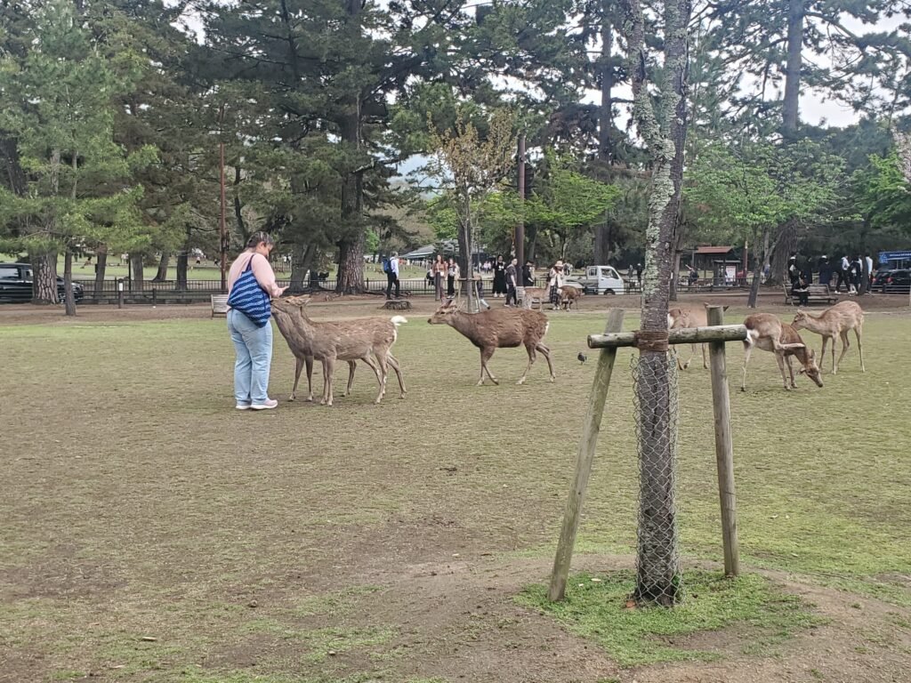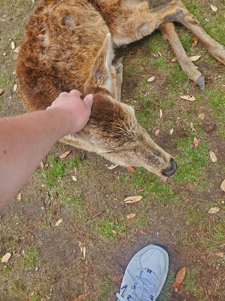 We passed through Noborioji Park, a small but beautiful green space that connects the city streets with the larger Nara Park area. It was here that we first encountered a massive number of deer – probably at least a hundred in this small park alone! Some people were feeding and petting them, as there are designated spots to buy deer crackers, and I even got a chance to pet one myself (and a few more later on).