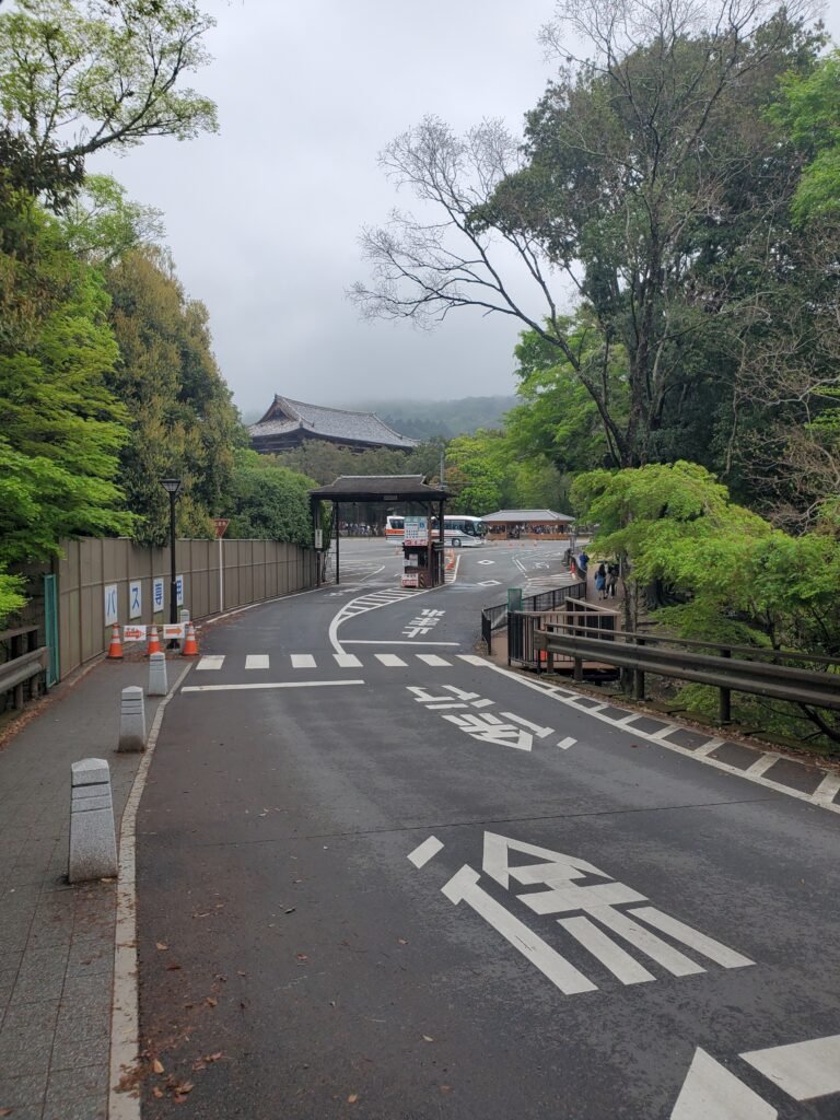 From there, we finally approached Nara Park proper. As we crossed the street, we noticed people being pulled in rickshaws – bet that’s not cheap! After this we walked down a sloped sidewalk toward a large parking area. Looming above the trees was a massive gate, signaling we were getting close. At this point, just after 2 pm, Carlos mentioned he was pretty tired, so he decided to chill on a bench by one of the nearby buildings while I explored for a while. I also brought his goshuin book with me so we could get the same stamps, as I had done in Kyoto that morning.