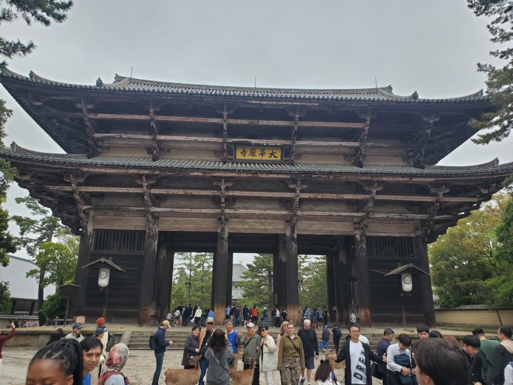 Soon enough, I headed under the Grand South Gate of Todai-ji Temple – a massive wooden gate dating back to the 13th century. Along the way, a few people were feeding the deer and getting absolutely swarmed, which was hilarious to watch!