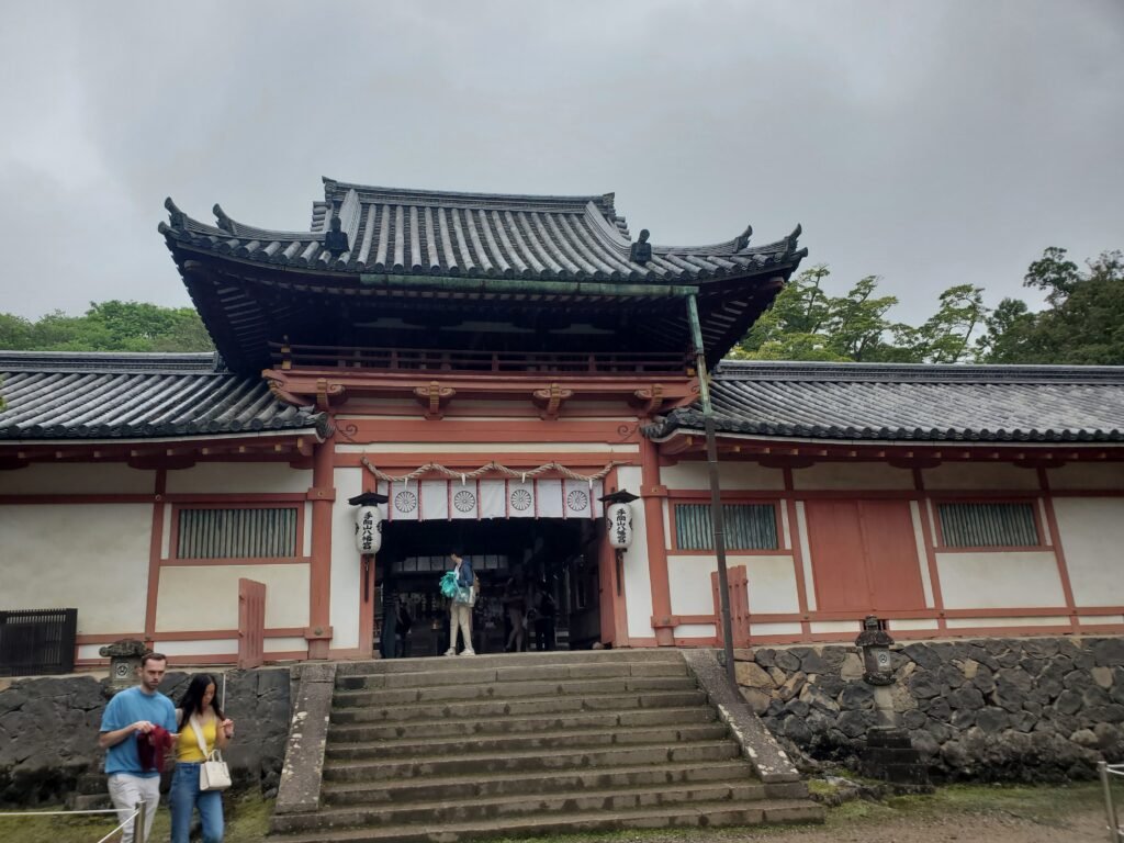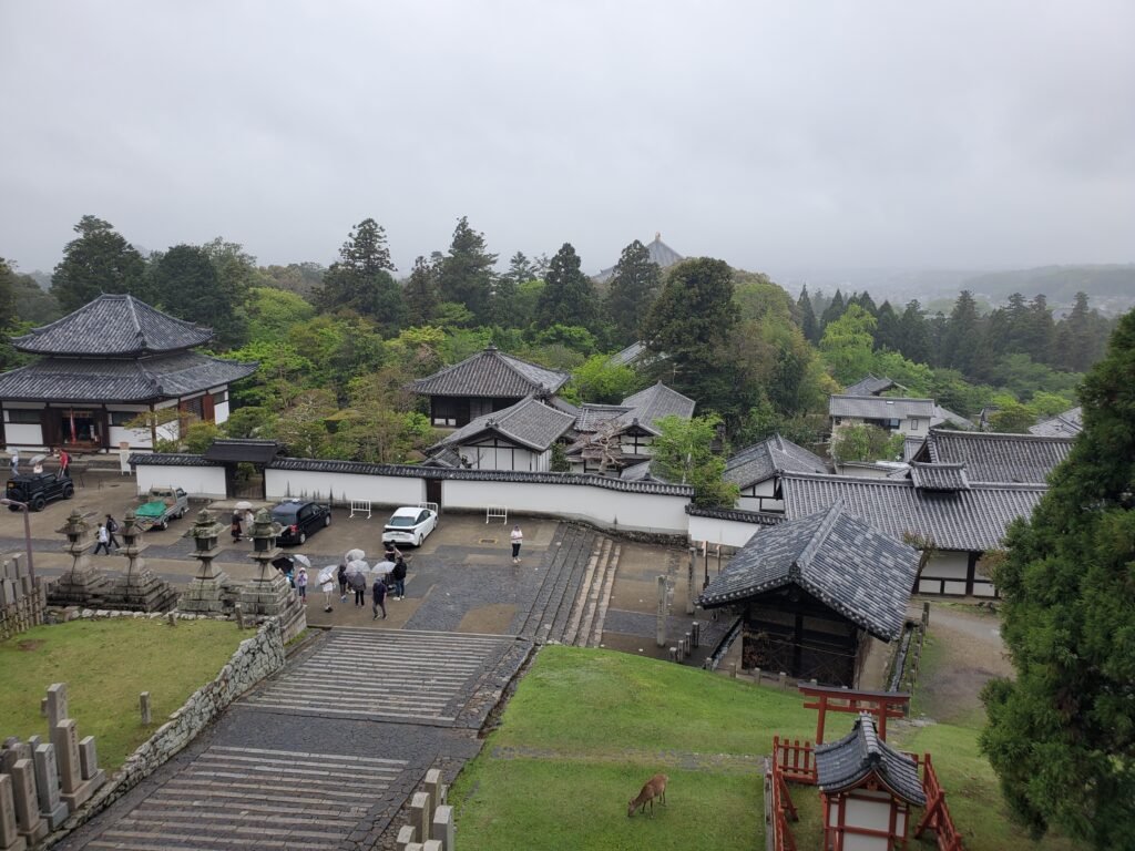 From there, I headed to another ancient building – Tōdai-ji Ni Nigatsu-dō, a stunning hall built in 752 AD on the hillside overlooking the grounds. I picked up another goshuin as the rain intensified, and it was honestly really nice to experience (especially since I was kept dry by an overhang)! As for the building itself, I really loved all the lanterns, wooden plaques with kanji, and ancient doors. There was also a platform with a beautiful view over the temple complex and the greenery of Nara, though the weather kept the distance hazy.