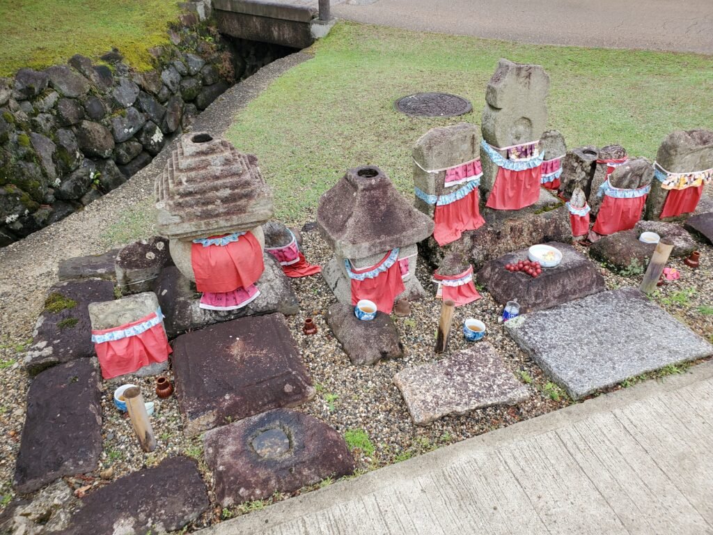 I then started down a thin, winding stone path between the buildings. I passed by a small sacred field where rice is grown for offerings, as well as a cluster of small stone statues. This was interesting, as people had left food, tea, and clothing – local offerings to a Buddhist deity named Jizō. It comes from his role as a protector of travelers and children.