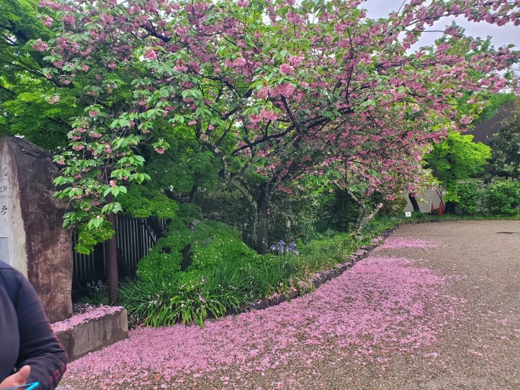 From there, we set off to explore more of Nara on foot, which ended up being a theme of the day. We didn’t use any public transportation after arriving, which let us soak in the atmosphere of the city at our own pace. We wandered out of the Kōfuku-ji complex and started making our way toward Nara Park, and the walk was full of sights. The landscaping was gorgeous, with tall trees, moss-covered grounds, winding paths, and scattered cherry blossoms – it really felt peaceful and almost otherworldly.