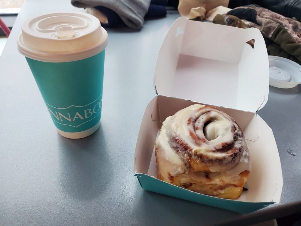The next thing on our list was Giordano’s, a famous Chicago restaurant chain known for their pizza – we wanted deep-dish while we were here. But it was only around 10:15 and they were not open yet, so in the meantime I found a Cinnabon where Justin and I got warm drinks and some cinnamon rolls. There was just enough seating for us to snag some spots, and we stayed here for a good 35 minutes as we watched the weather continue to worsen, especially the wind. They really call it the Windy City for a good reason!