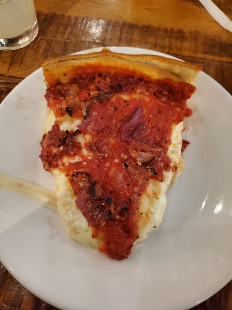 When we finally got our pizza, we saw why it took so long to bake. I knew that the sauce would be on top, but all the other toppings were as well. Not only that, but basically the entire pizza is stuffed. It’s almost like the opposite of a stuffed crust pizza! The waitress put a slice on each of our plates to start, and the cheese pulls were legendary – she did it like a pro!