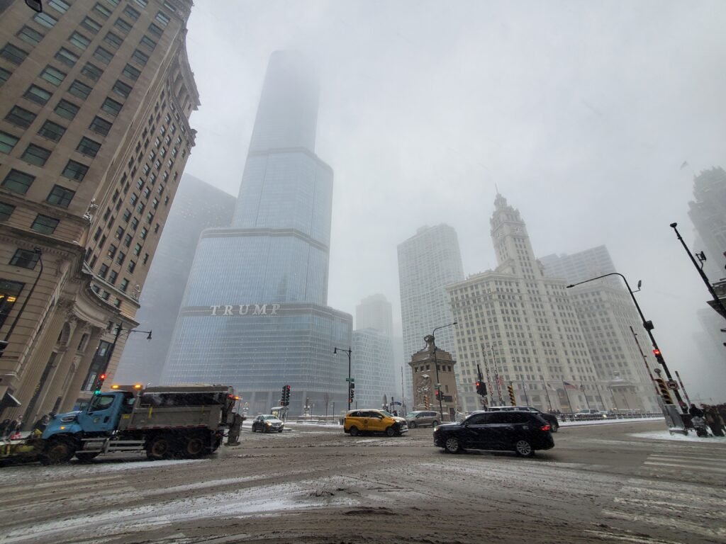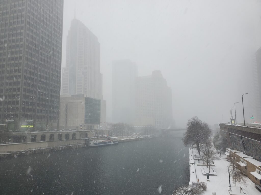 After this we headed off back into the flurry, which had picked up significantly, and we headed up towards the Magnificent Mile, the main commercial district. The buildings continued to loom over us, and eventually we got to the Chicago River again, as it goes around the Loop.
