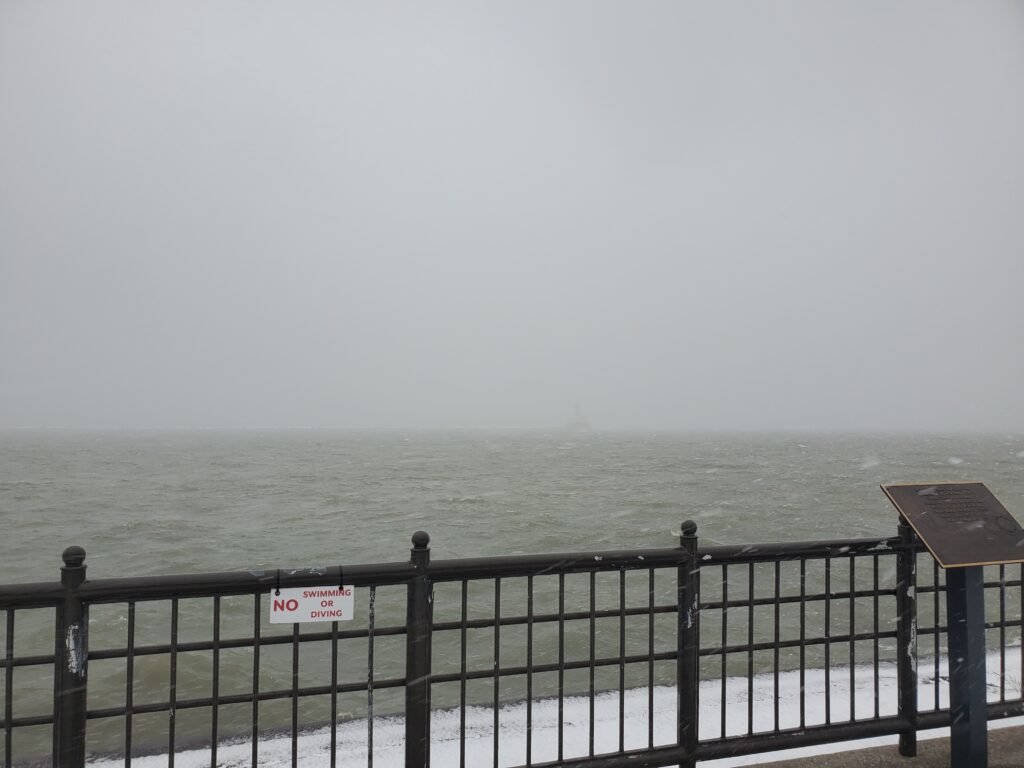 At the end of the pier it was so bad there were huge sections of ground with literally no snow, because it was all blowing away. The wind was probably 40 miles an hour! The visibility on the lake was pretty minimal, though the waves had whitecaps and looked like they were from the ocean.