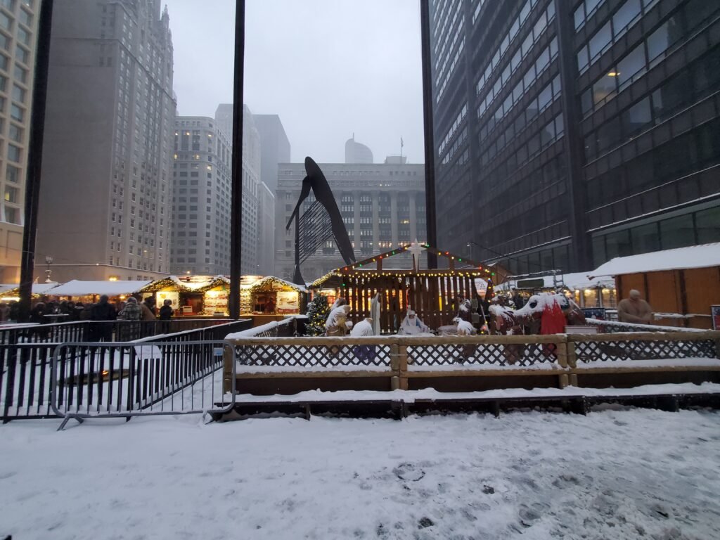 After a few minutes of rest, it was time for us to start heading back. Because I would be going straight to O’Hare, I would leave from a different station than Justin and my dad. After crossing the river we didn’t have to go terribly far though, it just felt like a long distance since we were tired, cold, and our shoes were wet from the slush. We finally made it to where my station (Washington) was, right near the Christkindlmarket – we did not go inside here but it was at least a pretty sight.