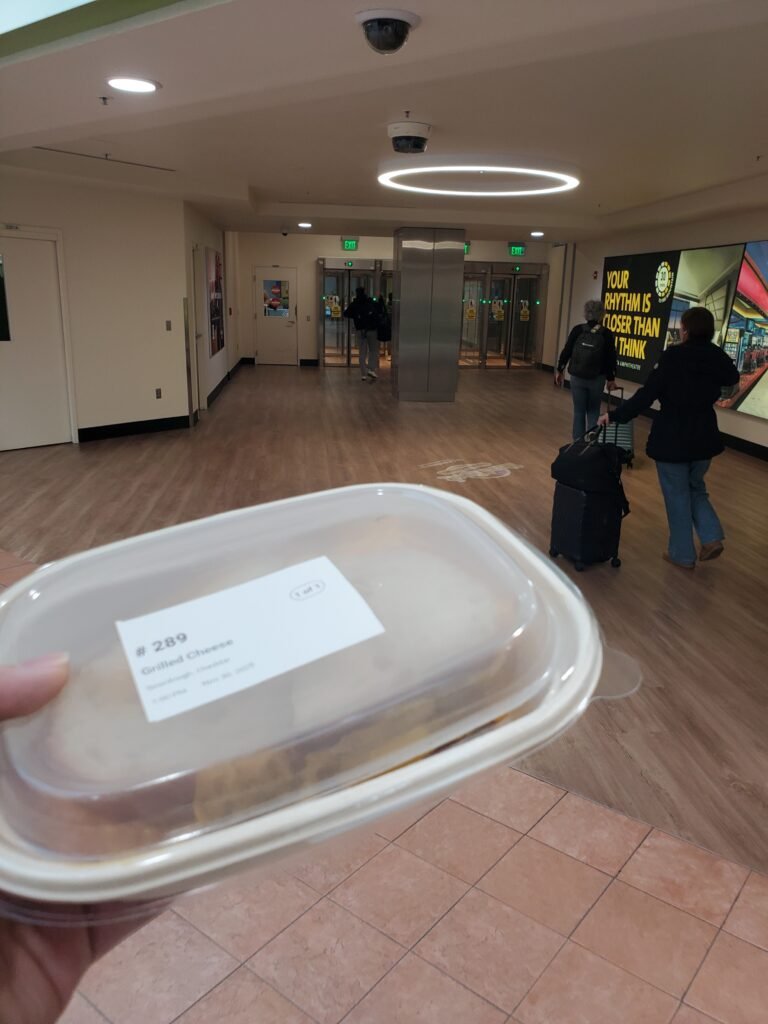 Once we finally made it I was super happy, as I had had one heck of a journey getting back. At least I made it back by 12:45 pm rather than 6 pm, which would have happened if I’d had the 2 layovers. To use up my last meal voucher, I decided to grab a grilled cheese sandwich to-go, and ate it on my way back to the parking lot.