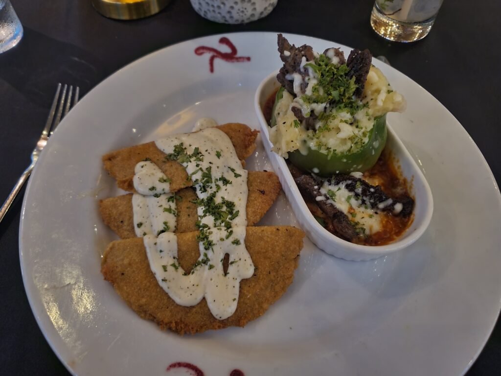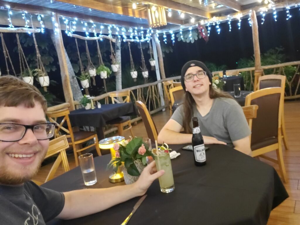 Dylan enjoyed another Belikin, while I got a mojito that was alright. The food was delicious though – I got the Pepper Bomb, a bell pepper stuffed with potatoes and topped with cheese and meat. It also came with some sort of fried dough with chipotle sauce on it. These were not the famous fryjacks of Belize, but were still quite good. The food was definitely pricier than the local spots as we’d come to learn, but we were satisfied.