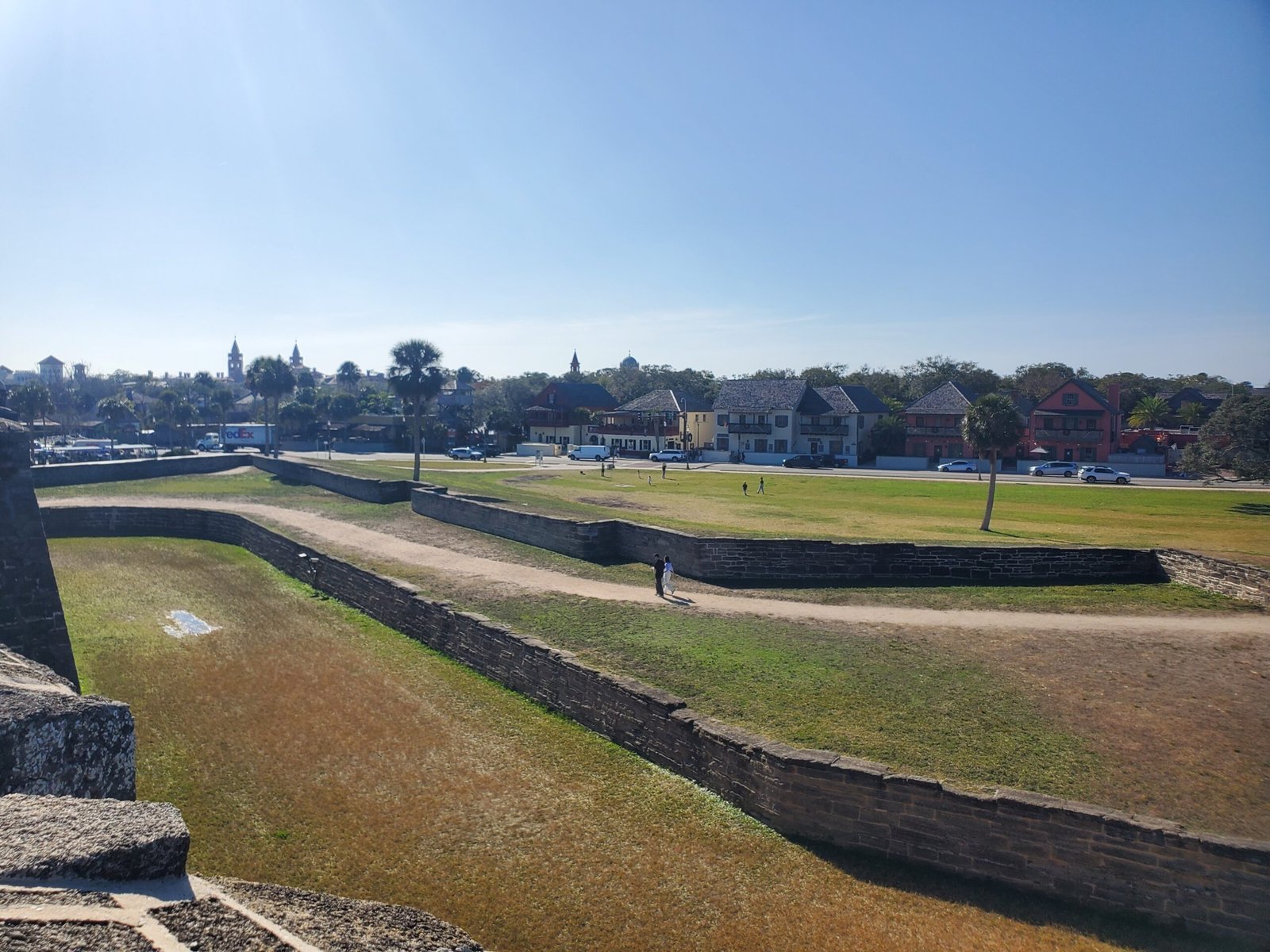 You cross a bridge to enter the fort, and from there you walk through a hallway. On the left is the gift shop where you can get a stamp for your National Parks passport book. After that is an open courtyard with tons of different rooms to check out. On your right you can find the stairs up to the top, as well as the restrooms behind them. Do be wary that the way up is not wheelchair-friendly.
